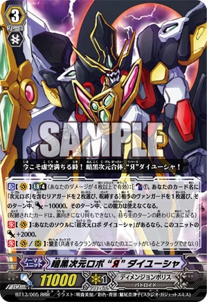 Now, this card is a bit frightening, considering it combos with Dimensional Robos. There is a D-robo that allows you to gain a Bonus Critical if you minus a few cards from hand. Now combine it with this ability. Your opponent is going to burn so much hand that you won't care about minusing yourself (which a few draw triggers would even erase) and potentially kill him all at once. This card alone would be 21,000 with Two crits versus a measly 0-3,000. Good luck opponent. Did I also mention that this makes Daiyusha the only card in the history of the game to have TWO CROSSRIDES? Run like 8 grade 3 and just do a bunch of combos of this card. The opponent won't know WTF is going on.